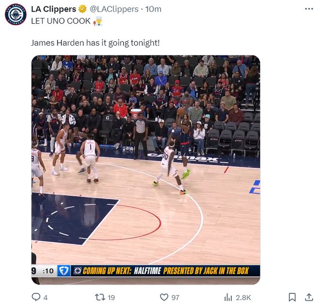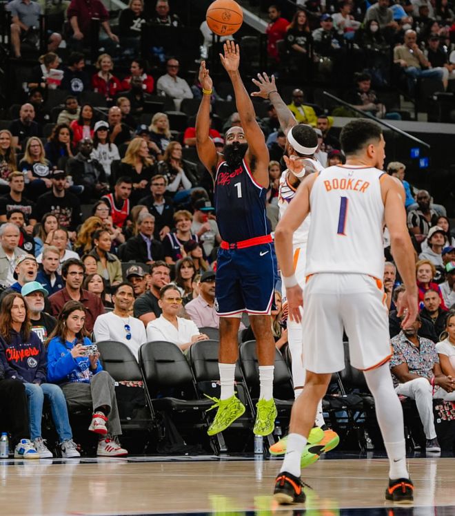 次节哈登从地上捡起来球立马三分出手都命中,单节哈登又命中三记三分球,第二节6分钟里连拿12分,上半场打完哈登8中7+三分5中5+罚球7中7拿到26分,在哈登的带领下快船大比分领先太阳。